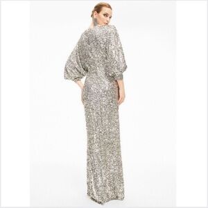 Embellished with sparkling sequins, the Gabby gown from Sachin & Babi features a blouson bodice with a plunging V-neck and relaxed bishop sleeves. A front slit finishes the look. She is all stars, sparkling as far as the eye can see.