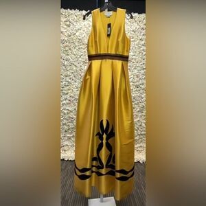 The Sachin + Babi gown is a captivating choice for wedding guests, showcasing a rich gold color. This sleeveless maxi dress features a dramatic plunge neckline and a fitted bodice that gracefully transitions into a voluminous A-line skirt. The elegant black accents at the waist and hem enhance its sophisticated appeal, making it a standout piece for any formal occasion.