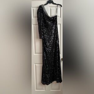 Sachin & Babi's Greta column gown showcases shimmering sequins with a contrast-trim asymmetric neckline. A concealed side zipper completes this one-sleeve style.
