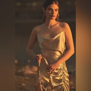 Sachin & Babi Jennings Ruched Hammered Satin Gown Side Slit Slip Dress 6 Small