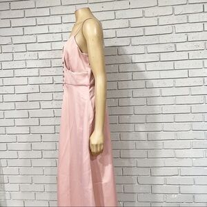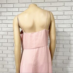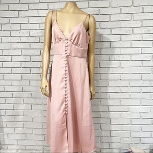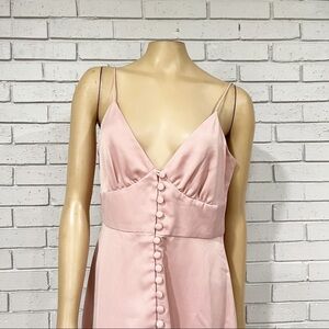 Slender straps and a row of dainty buttons add delicate detail to this soft satin dress with a fitted bodice and flowy midi skirt.