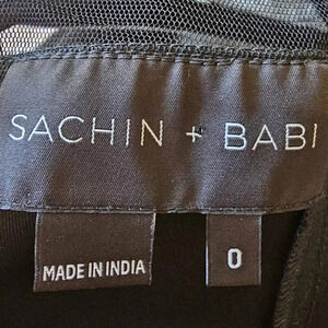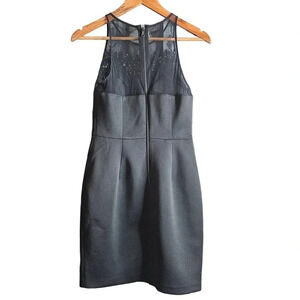Sachin + Babi Neoprene Mini Dress in Black. Size 0. Features crew neckline, sleeveless, mesh yoke with sequin details at breast, exposed back zipper closure, and mini length. 90% Polyester, 10% Spandex / Neoprene. Excellent condition, no flaws.