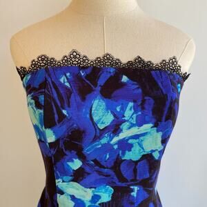 Very good condition. Bright blues. 3 smal places where it looks like a heel stepped on it in the back, but they're not noticeable (see last 3 photos). Otherwise the dress is flawless. 2 Pockets.