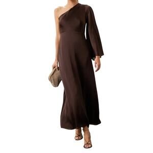 A Sachin & Babi one-shoulder gown radiates elegance with its flowing silhouette and dramatic single sleeve. The rich brown hue adds a touch of sophistication. Pair with strappy heels and a minimalist clutch for a refined ensemble.