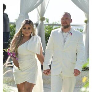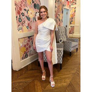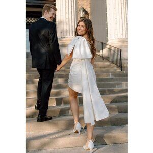 The Sachin & Babi Pippa Mini Dress is the perfect show-stopping number for every bridal occasion. This mini silhouette is made of a silky dupioni fabrication. A wrapped front and dramatic one-shoulder neckline with a bow sleeve are dotted with stunning droplets of beautiful pearls - finishing the look with a sea-inspired touch.