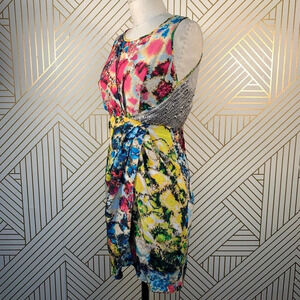 Sachin + Babi Multicolored Abstract Floral Print Sheath Dress with Zipper Back and Embellishment Sequins and Studs on Sides.