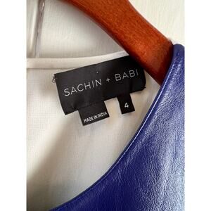 Sachin + Babi Revolve Lamb Leather Color Block Sleeveless Top, size 4. Very Good preowned condition. Features genuine lamb leather front, with triacetate poly back, keyhole back and round hemline. A real statement top! Perfect for a night out. Note that the label tag is only attached at one side