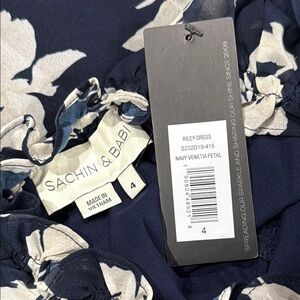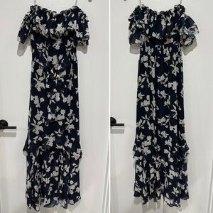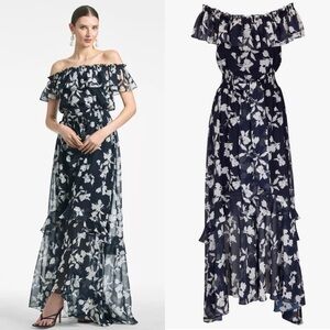 Elevate your wardrobe with the elegant Sachin & Babi Riley Maxi Dress. This stunning piece features a Navy Venetia Petal color/pattern. Crafted from elegant chiffon, this off-the-shoulder design is perfect for any occasion. Stretch around the waist with an adjustable self tie bow. Slight high low hem. Super comfortable and a timeless, elegant style. New with tags.