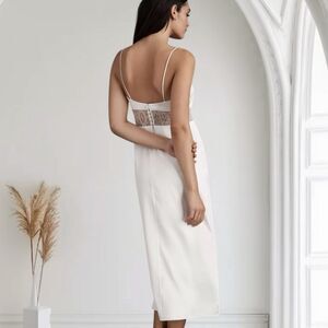 Sachin & Babi Bridal Jane Dress. White satin slip dress. Back satin faux button zip closure. Lace side panels. Size 0- ****measurements in photos.