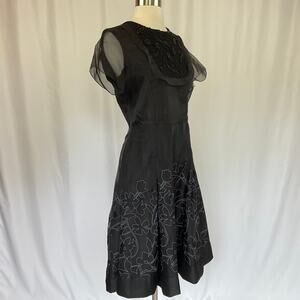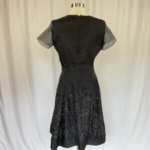 ~ Short, sheer sleeves ~ Round neckline ~ Pleated skirt ~ Flared, at the knee hemline ~ Concealed back zipper with hook and eye closure ~ Fully lined ~ Structured rayon/polyester/ linen