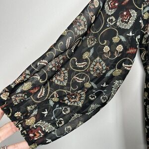 Add a pop of color to your wardrobe with this Sachin & Babi Women's Dylan Printed Cutwork Top Blouse. The intricate floral pattern and embroidered accents make it a perfect choice for any occasion, whether it's a business meeting or a party. The relaxed fit and balloon sleeves provide a comfortable and stylish fit, while the round neckline and hook & eye closure add a touch of elegance. Made with sheer chiffon material, this top is perfect for layering or wearing on its own. Available in size XS, this basic yet designer top is a must-have for any bohemian or colorful themed outfit.