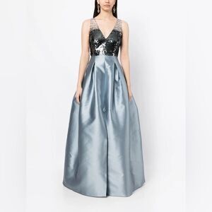 The Erica is an elegant gown dressed in sequins. The v-neck bodice of the dress is lit with silver sparkle, and the ash blue-colored Mikado skirt with center-front slit is both grand and elegant