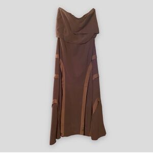 Comes with optional attachable spaghetti straps. New with tags. Gorgeous, unique, designer dress. Outer: 70% Modal 30% Polyester. Inner Lining: 100% silk.