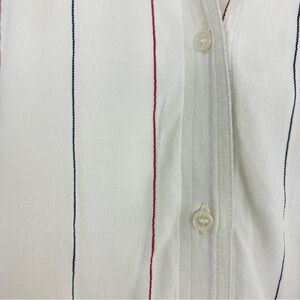 Sacrecoeur white button front long sleeved shirt. Navy and burgundy stripes. Exaggerated raglan sleeves and boxy, slightly cropped fit. Size Small