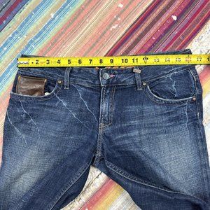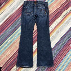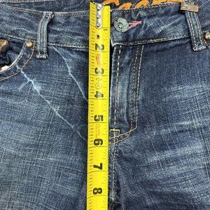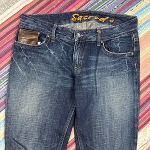 Sacred Boot Cut Flare Jeans Dark Blue Distressed Embroidery Women’s Waist 32 USA