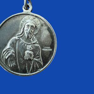 This is a previously owned, vintage Catholic medal. It has been washed but not polished. There is minor evidence of wear and/or storage. It features relief images of Mary on one side and Jesus on the other.