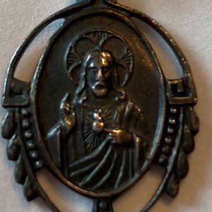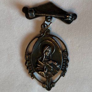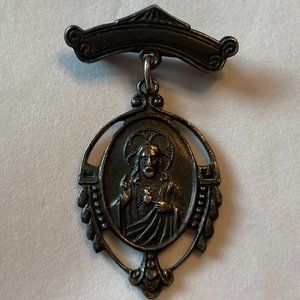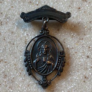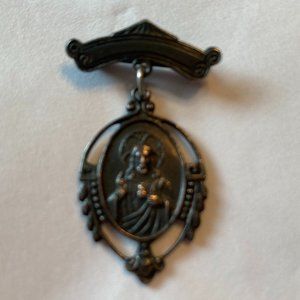 Sacred Heart of Jesus & Mary Brooch Bar Pin Pendant Medal Antique
