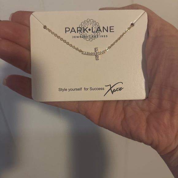 Delicate sideways cross pendent in high shine gold finish and sparkling cubic zirconia stones.