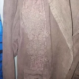 This Sacred Threads jacket is made of a Viscose/Cotton Blend that resembles corduroy, featuring a flattering fit in size L. The mid-length jacket has 3/4 sleeves with lace and embroidered accents, adding a touch of bohemian style. With a button closure and a solid brown color, this lightweight jacket is perfect for casual occasions during the summer, fall, and spring seasons. Made in India, this piece exudes a hippie and college-inspired vibe, ideal for women who appreciate a unique and laid-back look.