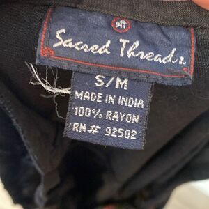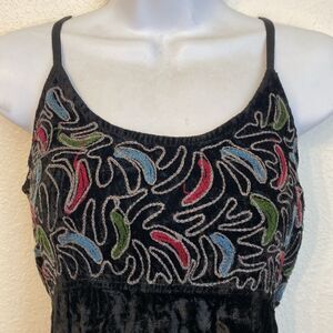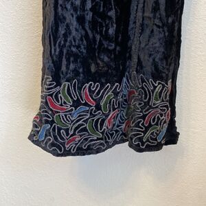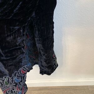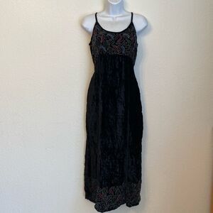 Black crushed velvet maxi dress with embroidery detail from Sacred Threads. Tie back waist. Side slit. Size small/medium.