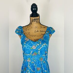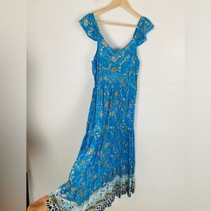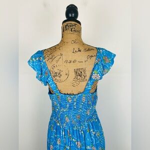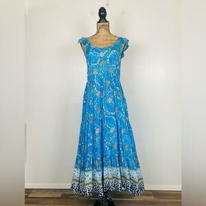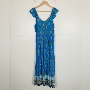 Sacred Threads Floral Tiered Maxi Dress L/XL Blue Flutter Sleeves Smocked Boho