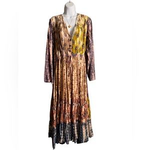 Bohemian style maxi dress with a mix of vibrant patterns. Features long sleeves and a flowing skirt. Perfect for a casual, artistic look.