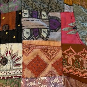 Vibrant patchwork design. Button-up front. Unique patterns and textures. Perfect for a bold statement.