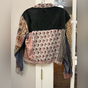 Sacred Threads Patchwork Jacket, a bohemian-style cropped garment known for its eclectic mix of colors and textures.