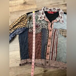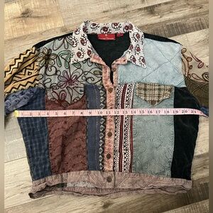 Design: Features a unique "funky" patchwork construction with embroidered details, corduroy panels, and various printed fabrics.