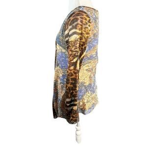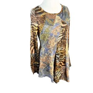 Colorful patchwork tunic top, in leopard prin, striped stitching and boucle panels