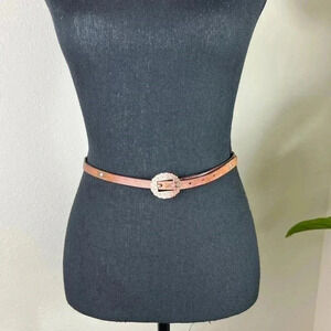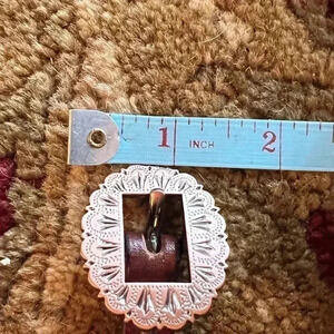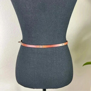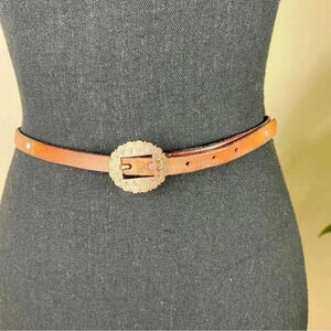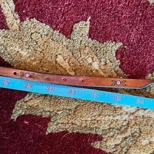 Unbranded Genuine leather skinny belt with stamped and hand painted miniature flowers and leaves with a delicate, carved copper tone buckle. (Styled on. Size 4 mannequin.) Size: Medium In GREAT pre-loved condition!