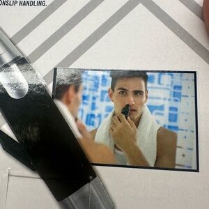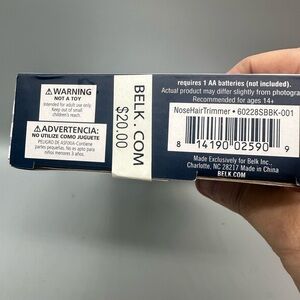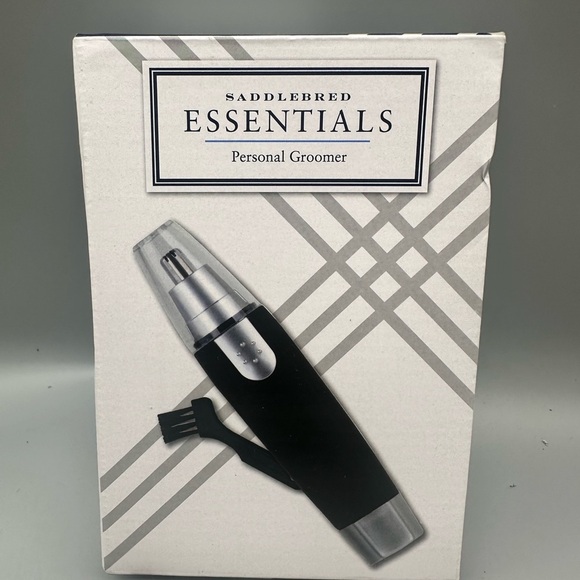 Compact personal groomer. Sleek black and silver design. Includes cleaning brush.
