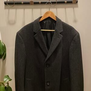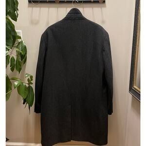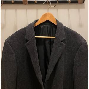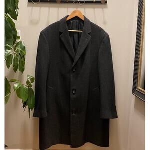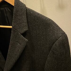 Elevate your wardrobe with this Saddlebred wool blend men’s coat in size 46R. This timeless overcoat features a subtle herringbone pattern in charcoal gray, making it a versatile choice for both formal and casual occasions.