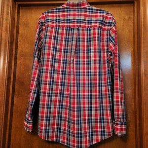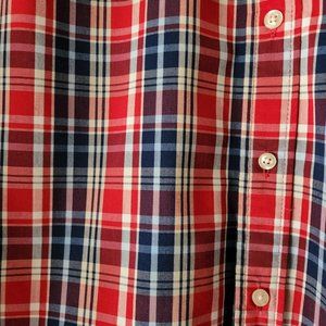 Classic plaid shirt for spring and summer wear! Vibrant colors of red, navy blue and white! Button down collar with locker loop on the back. Would pair great with slacks, jeans or nice shorts. A sharp shirt!