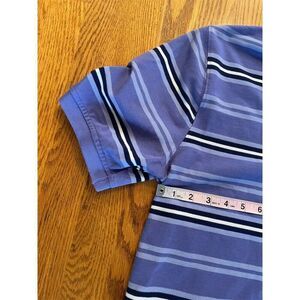 Keywords: Saddlebred, multicolor, purple, large, men's polo, short sleeve, striped, casual, spring, breathable, cotton, polyester, collared, button closure, pre-owned.