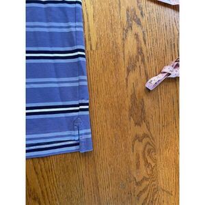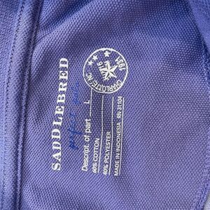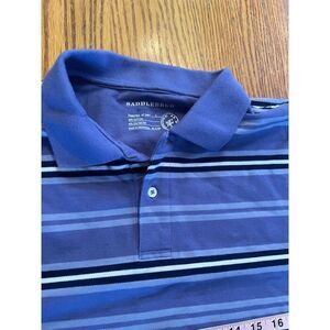 Keywords: Saddlebred, multicolor, purple, large, men's polo, short sleeve, striped, casual, spring, breathable, cotton, polyester, collared, button closure, pre-owned.