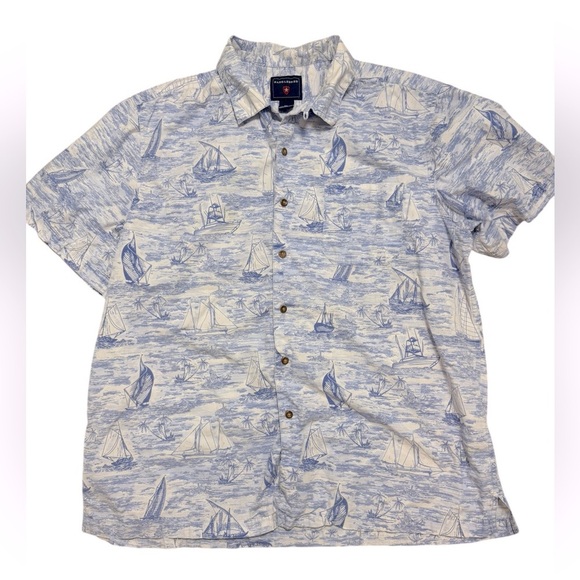 Casual and coastal Saddlebred men’s short sleeve button-down shirt in a blue and white nautical print featuring sailboats and ocean waves. Made from soft, breathable 100% cotton — perfect for vacations, beach days, or weekend wear. Lightweight with a relaxed fit that keeps you cool and comfortable all day.
