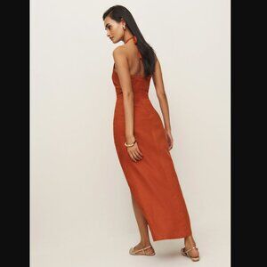 Sadey Linen Dress from Reformation, a maxi length dress with a halter neckline, side slit, and ruching throughout.
