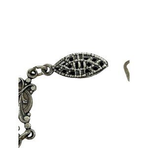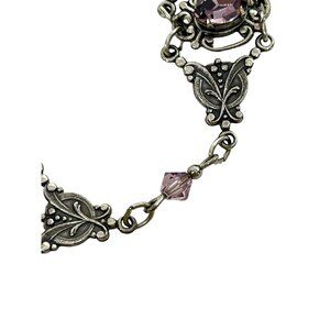 • Victorian, silver tone, faux oval amethyst stones, floral filigree, 3 panels, beads, slide clasp