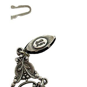 0166B- Women’s Victorian-style silver tone & faux amethyst bracelet by Sadie Green, signed, vintage 1980s, 7” long, 3/4” wide. 3 openwork panels with molded, filigreed floral designs, connected with round chain links, and two faceted purple beads. Three round.faux amethyst, stones, slide-in, turn and lock-in clasp. Reminiscent of ornate Victorian designs. Weighs 6 g. Gently preowned. Excellent condition.
