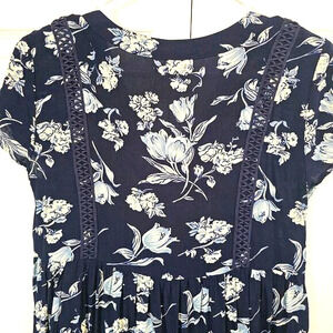 Lovely lightweight flowy blue and white floral dress with trim detail. Front buttons. Excellent condition