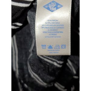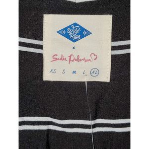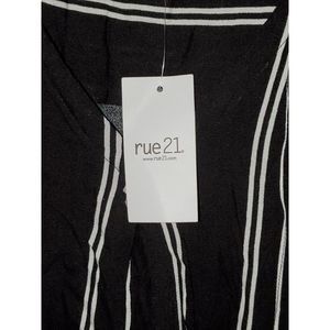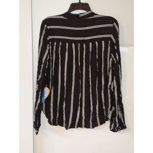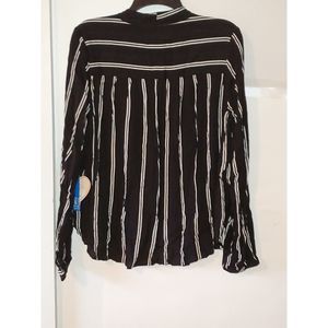 Very cute Sadie Robertson blouse. This piece has never been worn and still has all of the tags. It was made for Rue21. This is mostly black with white vertical stripes. It also has a high/low hemline and ties at the neck. 100% rayon, in unworn condition. 21" from armpit to armpit and 23" from shoulder to front hem.