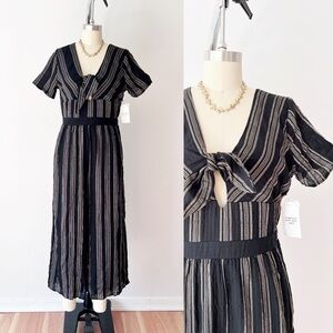 Sadie & Sage Black and Cream Jumpsuit with Peekaboo Detail and Front Tie Striped