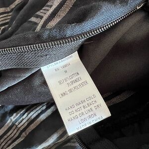 Chic jumpsuit with black and cream stripes. Features a stylish tie-front detail and elastic waistband. Side zipper and back of neck button for easy on and off. Outer is 97% cotton 3% Spandex. Fully lined. Nicely made!