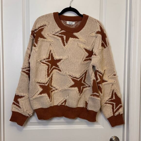 Embrace the cozy charm of the Sadie & Sage sweater, showcasing a delightful star print on a cream backdrop with brown accents. This crew neck, long-sleeved knit is perfect for adding a touch of warmth and style to your wardrobe. Its balanced design and striking contrast make it a standout piece for any casual occasion.