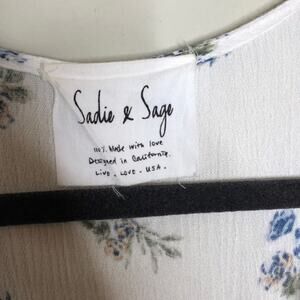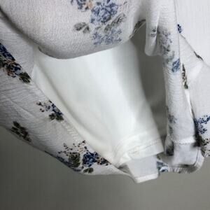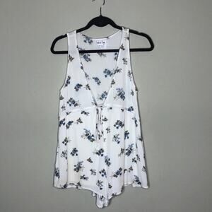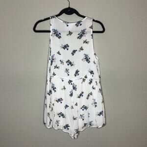 Super cute romper! Blue floral design on white gauze fabric. Deep v neckline. Bottom has additional short layer so romper isn’t see through. Tie on front around waist. Size small