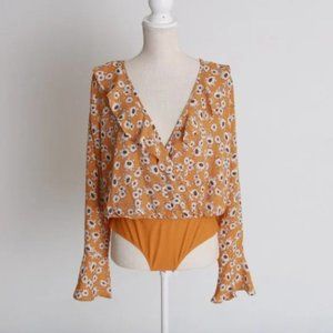 Sadie & Sage Mustard Yellow Floral Ruffle Bodysuit.