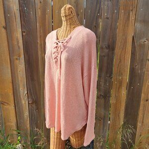 Sadie and Love pink Knit Sweater SZ. XL Lace up V Neck Made with Love in Cali.