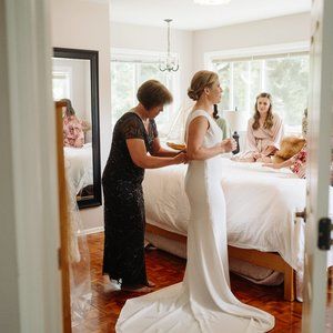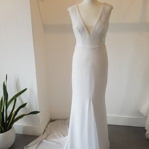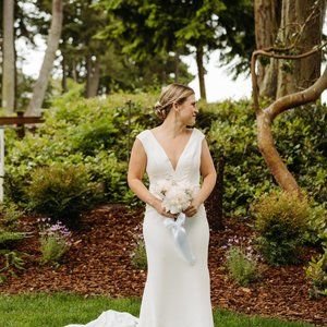 Selling my wedding dress - Sadie by Made With Love. Size 8, brand new retailed at $2700. Worn once and dry cleaned after use. Alterations included hemming and taking in the shoulder height (my height is 5'4"). Other alterations included a bustle addition and snaps in the shoulders to keep in bra straps/spanx. No padding in the chest. Material is french crepe. It has a beautiful train. It is incredibly comfortable and not heavy!