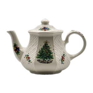 The Sadler England Teapot is a vintage ceramic piece with an octagonal shape and a capacity of 4 cups. It features a festive Christmas Eve Salem Tree design, making it a limited edition collectible perfect for holiday gatherings. Handmade in England in 1942, this teapot comes with a lid and is decorated with a glossy finish. This unique teapot from the Victorian style era is a charming addition to any tea and coffee pots collection, showcasing traditional British craftsmanship and festive design.